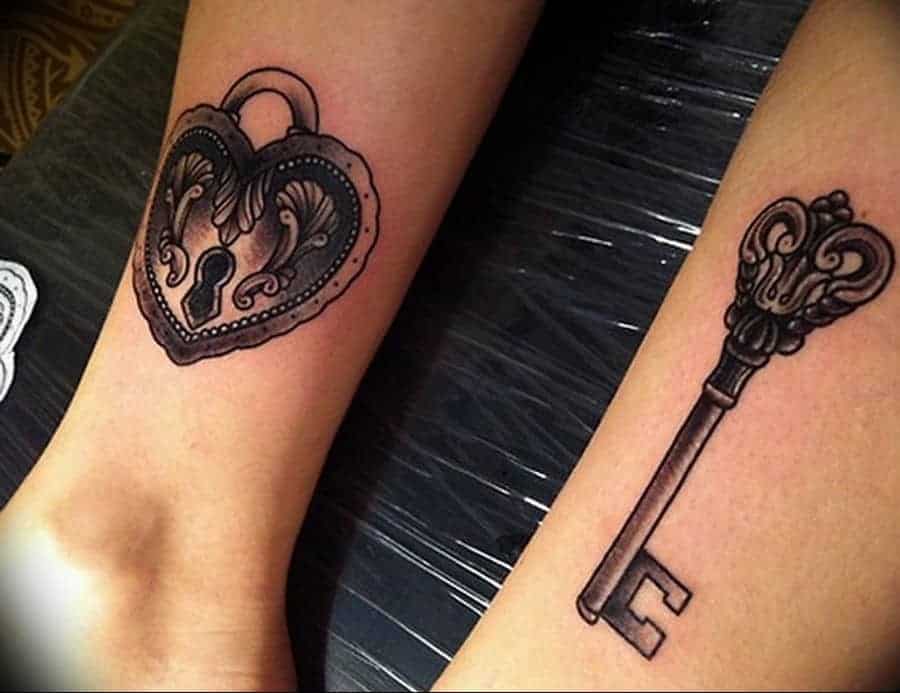 - Ключ и замок – символ «ты открываешь моё сердце». Часто размещают на рёбрах или предплечье.