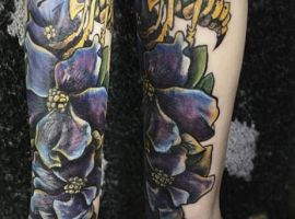 Довольно часто тату пчелы, осы на ноге или руке дополняются другими элементами. К примеру, это тату с пчелой и сотами, спелым фруктом, красивым цветком.