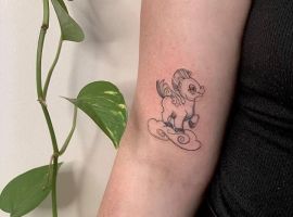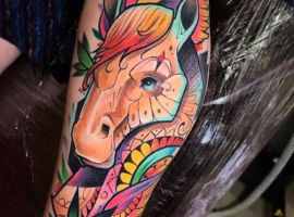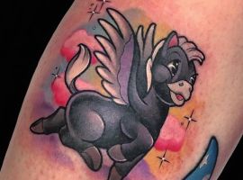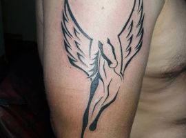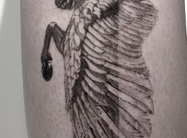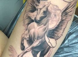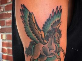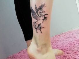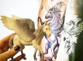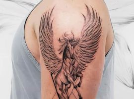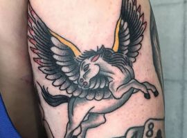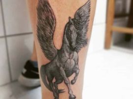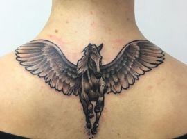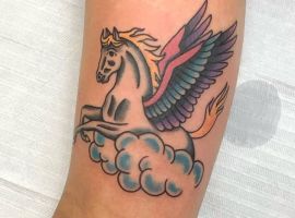 Так что татуировка, где запечатлена крылатая лошадь, может обозначать выносливость и стойкость характера своего обладателя. Умение Пегаса молниеносно летать олицетворяет скорость. По преданию, его не получится поймать простым способом, так как для поимки требовалась ценная уздечка из золота.