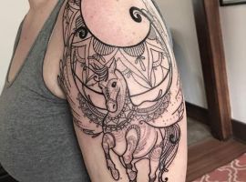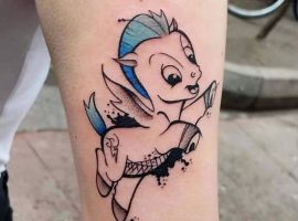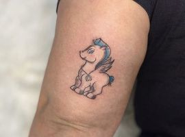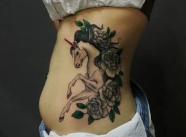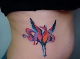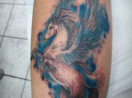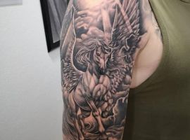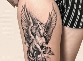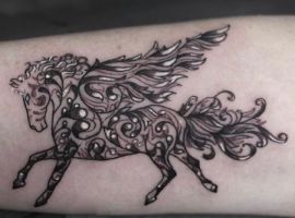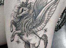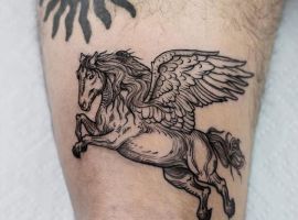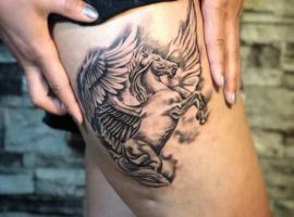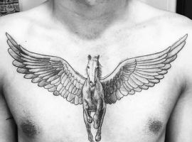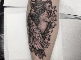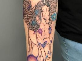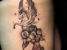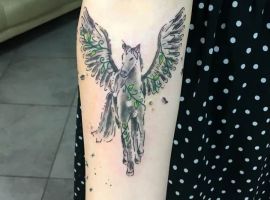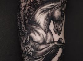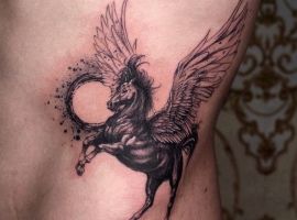 Изображение тату пегас на коже символизирует превосходство духовных ценностей над материальными вещами. Если расшифровывать данный образ, обращаясь к мифологии, то это создание было преданным помощником Персея, сражаясь на пару с ним со страшными чудовищами.