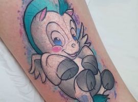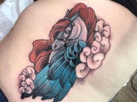 На многих эскизах его можно увидеть во время прыжка или полета. В большинстве случаев мастера набивают тату, где у пегаса расправлены крылья.