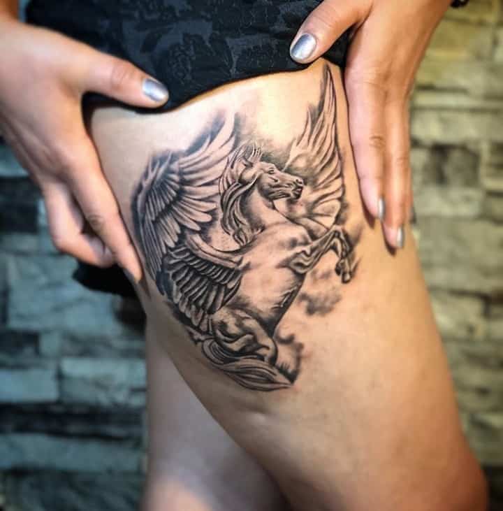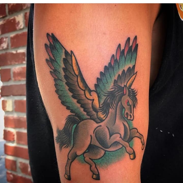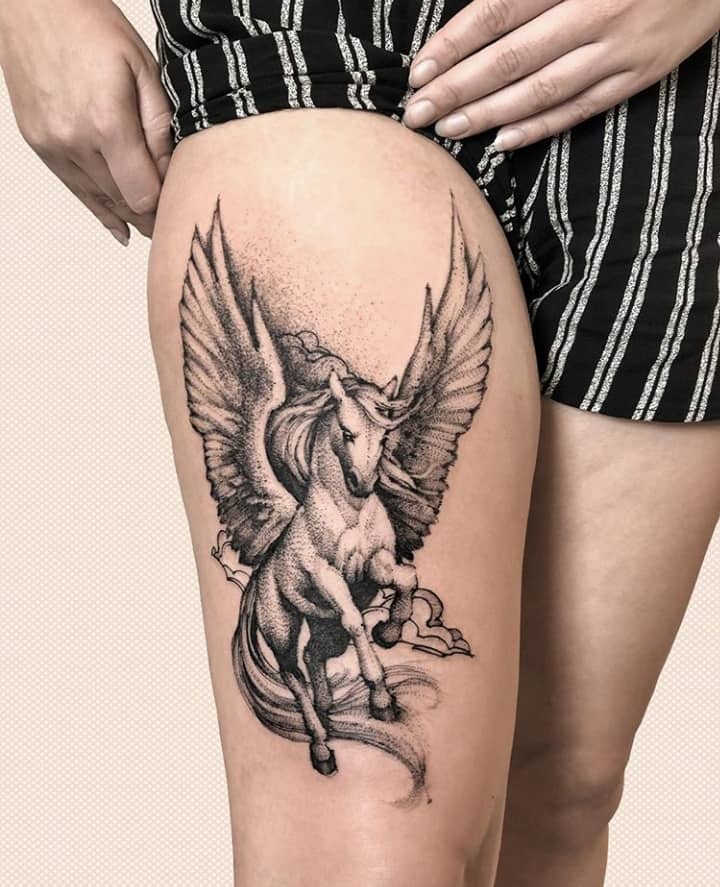 Так что татуировка, где запечатлена крылатая лошадь, может обозначать выносливость и стойкость характера своего обладателя. Умение Пегаса молниеносно летать олицетворяет скорость. По преданию, его не получится поймать простым способом, так как для поимки требовалась ценная уздечка из золота.