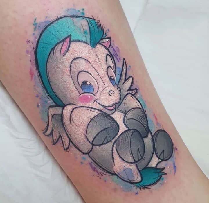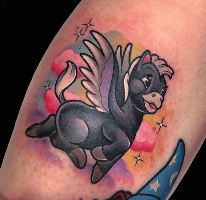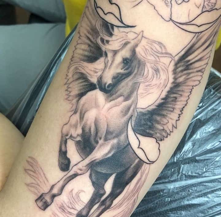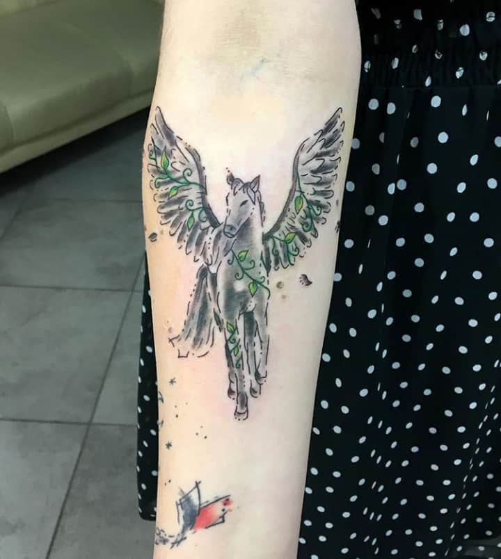 На многих эскизах его можно увидеть во время прыжка или полета. В большинстве случаев мастера набивают тату, где у пегаса расправлены крылья.