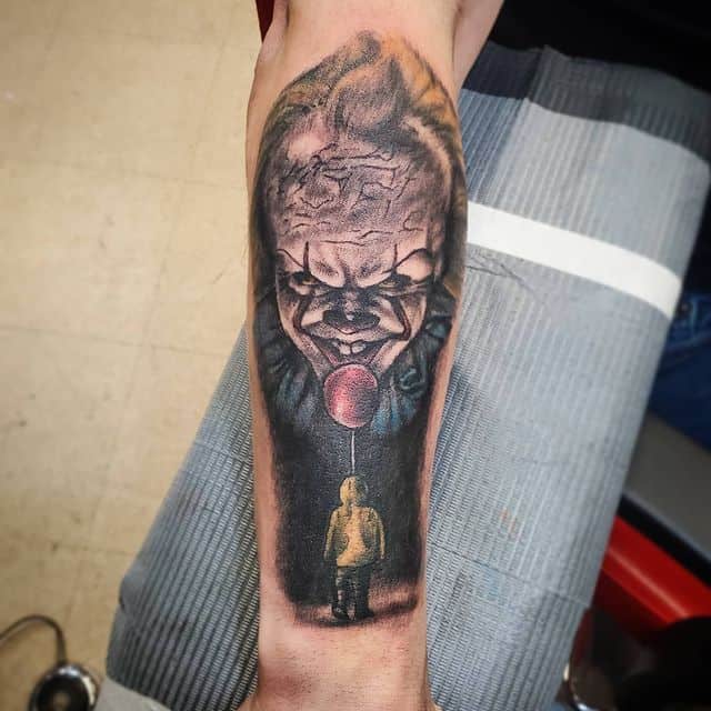 Пеннивайз известен своей злой улыбкой, очень высоким лбом с лысиной, рыжими волосами, белым гримом и нарядами с пышным жабо. Чаще всего, в тату он именно зловеще улыбается, однако, бывает и с серьезным, грозным лицом. Ну а «визитной карточкой» персонажа является известный красный воздушный шарик. Часто именно с ним клоуна и изображают в тату. Также нередко в тату Пеннивайза наносят «в паре» с мальчиком в желтом плаще – еще одним персонажем фильма. В таком случае первый олицетворяет зло, а второй – чистое, непорочное добро.