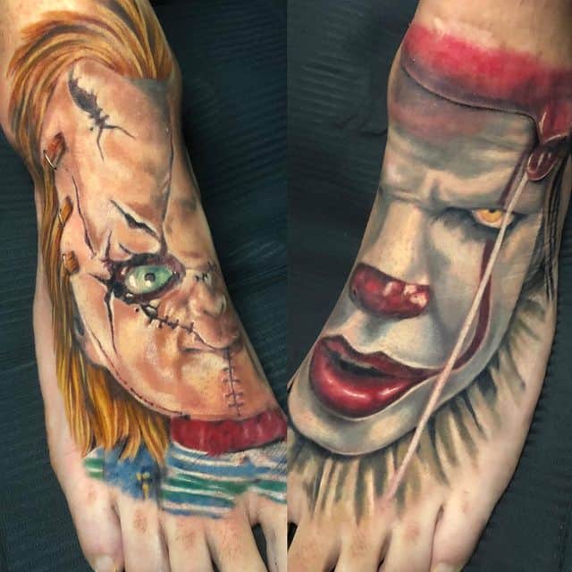 Одно из самых известных произведений Стивена Кинга, если не самое известное, «Оно» было экранизировано в насыщенную дилогию фильмов-ужасов с тем же названием. Поклонников этого писателя по всему миру такое огромное количество, что кажется, их не меньше, чем любителей фильмов ужасов. И первые, и вторые иногда наносят на кожу тату в виде персонажей страшной истории.