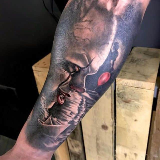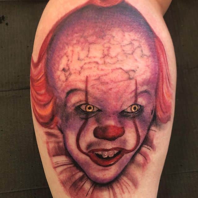 Татуировки с клоуном Пеннивайз из фильма «Оно» обрели популярность в 2017 году, когда фильм вышел в свет. Кино получилось таким ярким и насыщенным, что обрело миллионы фанатов по всему миру. В свою очередь, главный герой – сам клоун получился таким харизматичным и запоминающимся, что его образ и стали наносить на кожу.