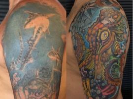 Старую цветную татуировку можно перекрыть новой. Однако, нужно очень аккуратно и грамотно подбирать эскиз. Обратитесь за консультацией к опытному тату-мастеру, в портфолио которого уже были такие работы. Он поможет подобрать подходящий эскиз, либо создаст его специально для Вас.