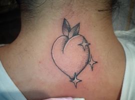 Конечно, татуировка может быть как самодостаточной, так и дополненной другими элементами. Вариаций масса. К примеру, неординарно смотрится персик с сердечками или поцелуйчиками, веточкой весенних цветов, надписями и другими символами.