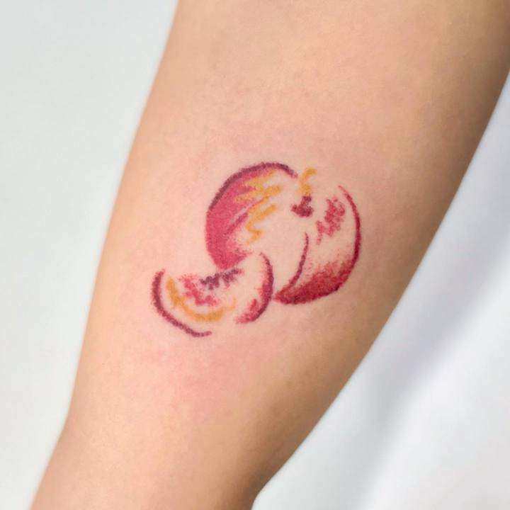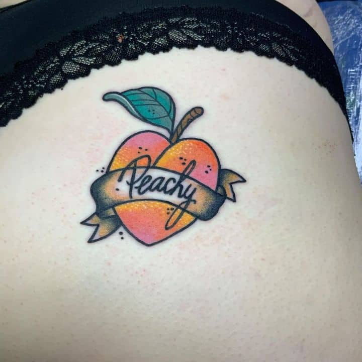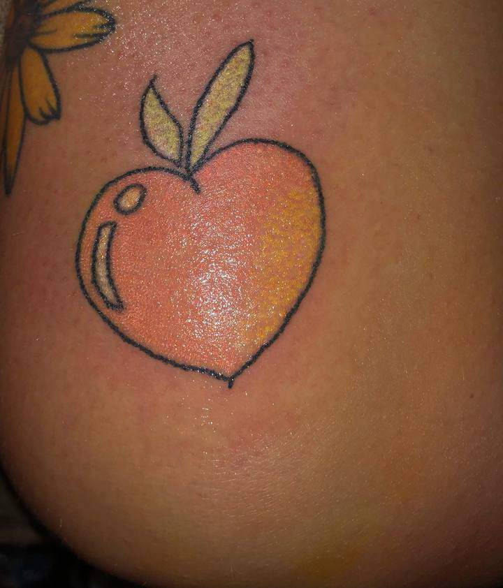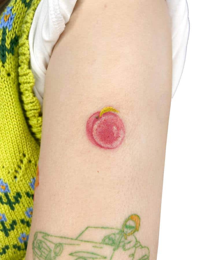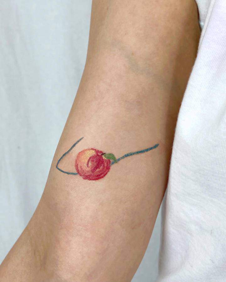 Конечно, татуировка может быть как самодостаточной, так и дополненной другими элементами. Вариаций масса. К примеру, неординарно смотрится персик с сердечками или поцелуйчиками, веточкой весенних цветов, надписями и другими символами.