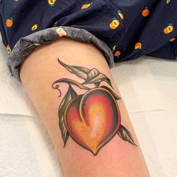 Эффективно татуировка свежего и сочного фрукта смотрится в цвете. Подходящие стили: олд скул, нью скул, реализм, акварель. Также неординарно смотрится персик и в мультяшном стиле. Но, конечно, можно обратить внимание и на графику, геометрию. С помощью этих стилей получится подчеркнуть неординарность и стилизованность символа.