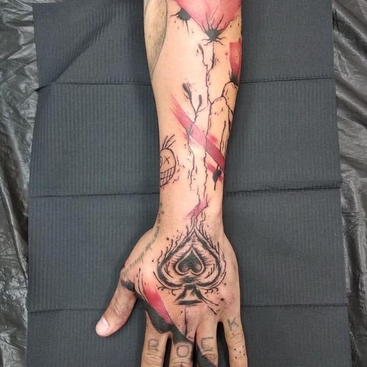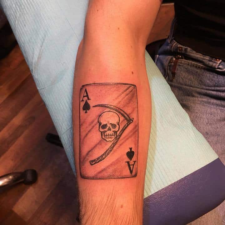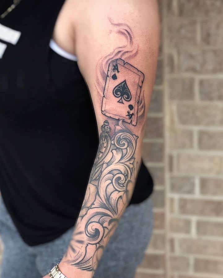 - Если в тату компонуется карта с оружием, черепами, деньгами – это может обозначать игру со смертью, азарт, риск. Такой человек уверен в своей удаче.