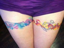 - На всю длину ног (чулки) или только на бедре (подвязка). Первый вариант выполняется в различных стилях. Например, сами чулки можно изобразить в виде одной линии на задней части ноги или же надписи на всю поверхность кожи. Чтобы тату смотрелось гармонично, принято забивать обе ноги.