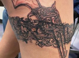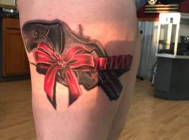 Женщина – это оружие замедленного действия, которое взамен дарит любовь и красоту. Это символизируется в татуировке подвязки с револьвером или пистолетом.
