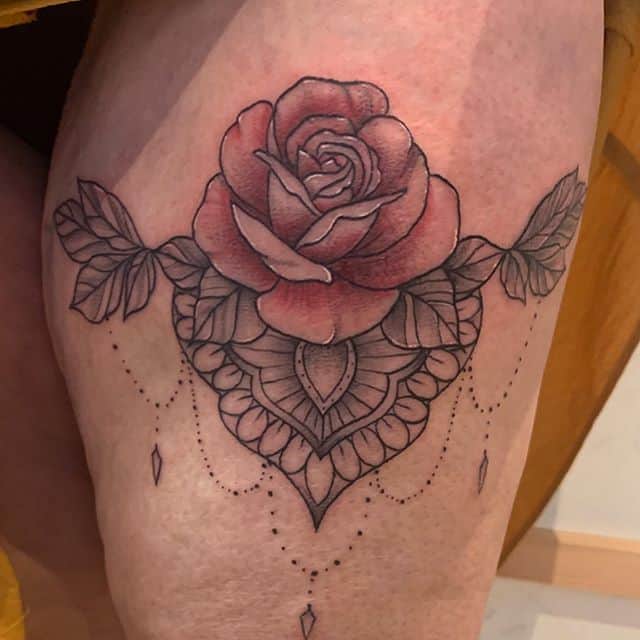 - Орнамент. Это наиболее популярная техника нанесения. Если девушка предпочитает монохромные тату, то этот вариант для нее. Благодаря данной технике рисунок имеет вид кружева, что придает реалистичности.