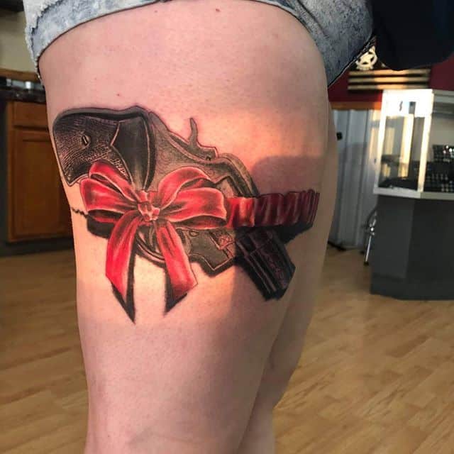 Женщина – это оружие замедленного действия, которое взамен дарит любовь и красоту. Это символизируется в татуировке подвязки с револьвером или пистолетом.