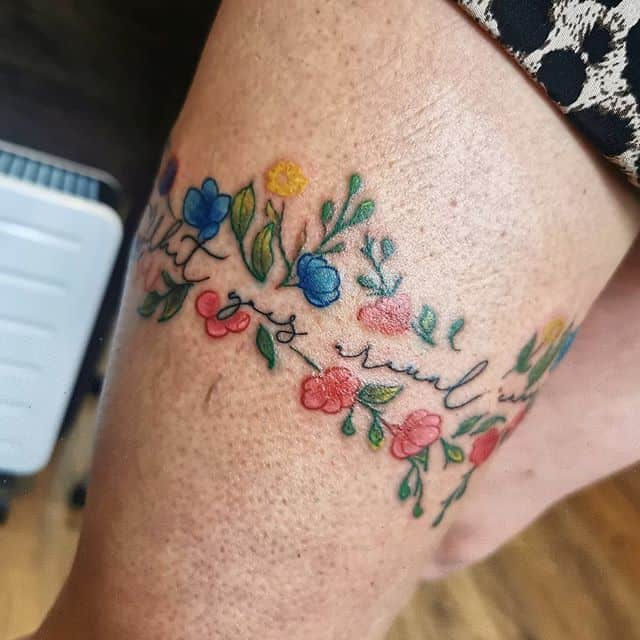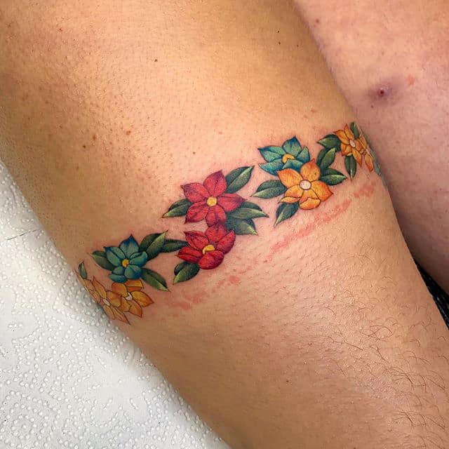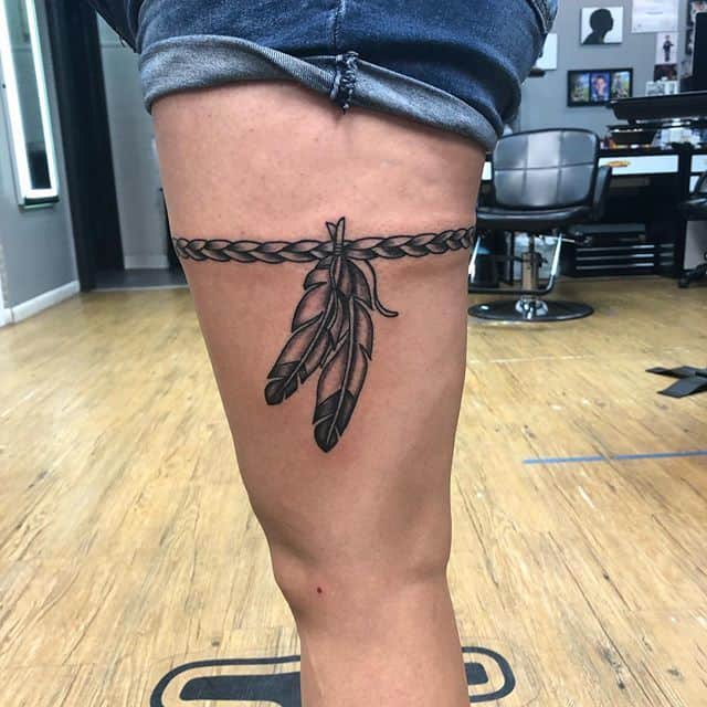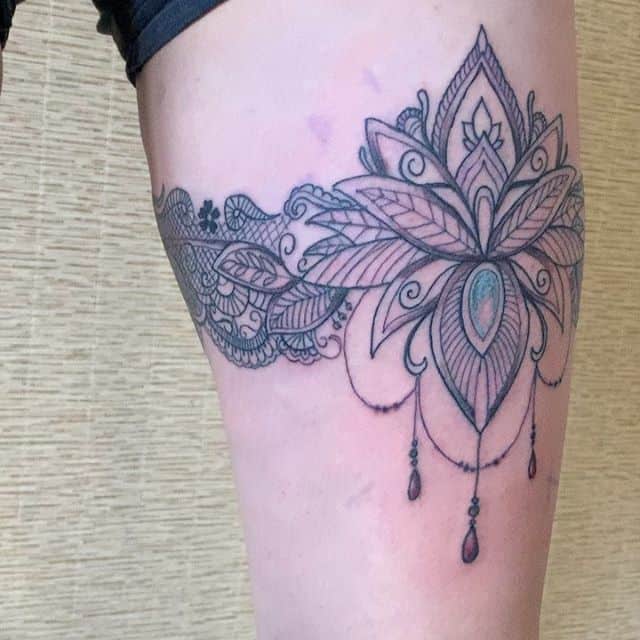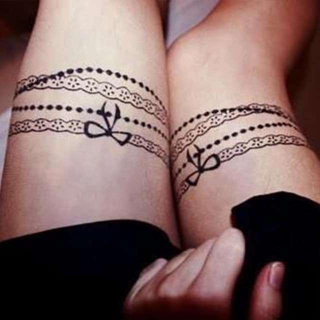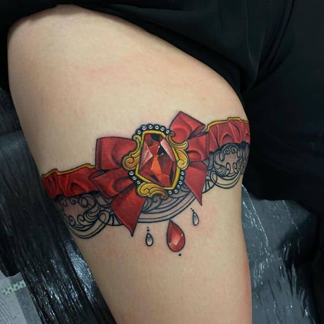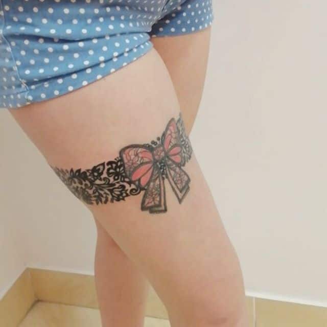 - Цвет. Необязательно ограничиваться только одним цветом. Например, популярно делать тату подвязки в черно-красном цвете, что отражает сексуальность человека. Некоторые предпочитают более спокойные и приглушенные оттенки, отражающие нежность и чувственность натуры.