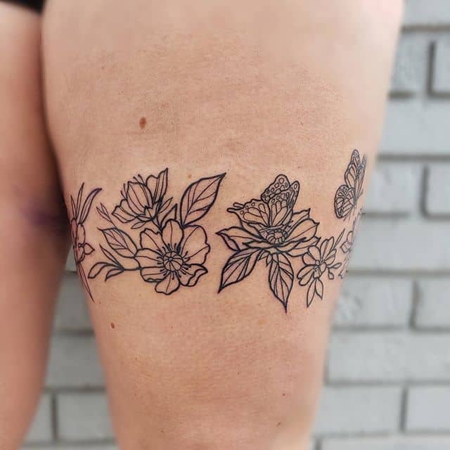- На всю длину ног (чулки) или только на бедре (подвязка). Первый вариант выполняется в различных стилях. Например, сами чулки можно изобразить в виде одной линии на задней части ноги или же надписи на всю поверхность кожи. Чтобы тату смотрелось гармонично, принято забивать обе ноги.
