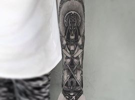 Пол рукава дает пространство для фантазии. Цельная композиция или отдельные символы, объединенные идеей. Фон – пламя, орнаменты, узоры. На руке рисуют животных, растения, портреты, пейзажи, религиозные мотивы.