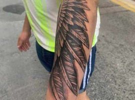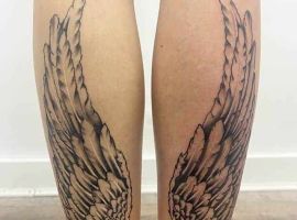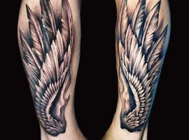 Тату крылья на ноге для мужчины – знак противоречивости характера. Такой человек любит риск, готов идти на авантюры, бросать вызов общепринятому мнению. Если рисунок сочетается с черепами, ножами, оружием, то его обладатель – сильная личность, способная противостоять другим и отстаивать свою точку зрение. Это прирождённый лидер, смело идущий на отчаянные поступки.