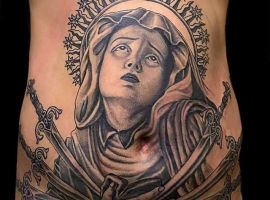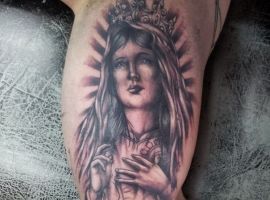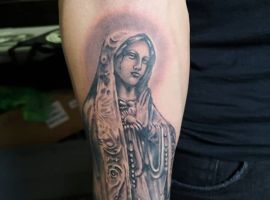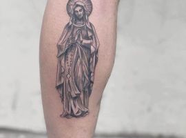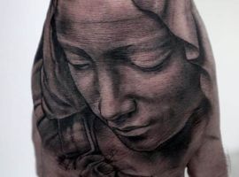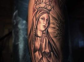 - Изображение Девы Марии. Матерь Спасителя – это тоже довольно распространенный символ в мире религиозной художественной татуировки. Прежде всего такое изображение на теле говорит о духовности, доброте, чистоте, святости, непорочности.