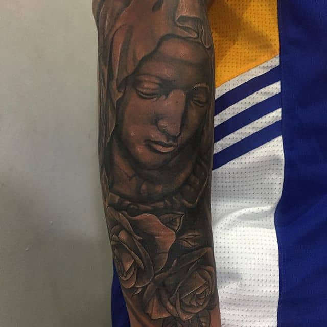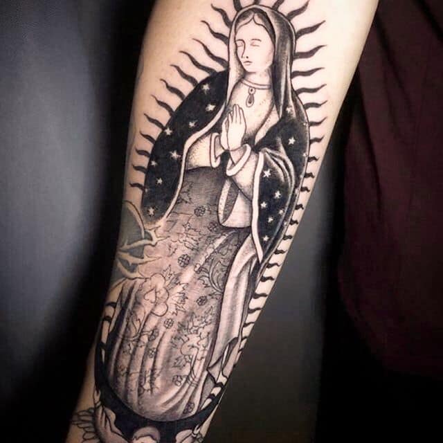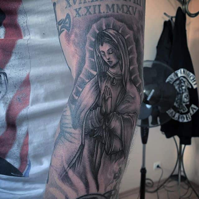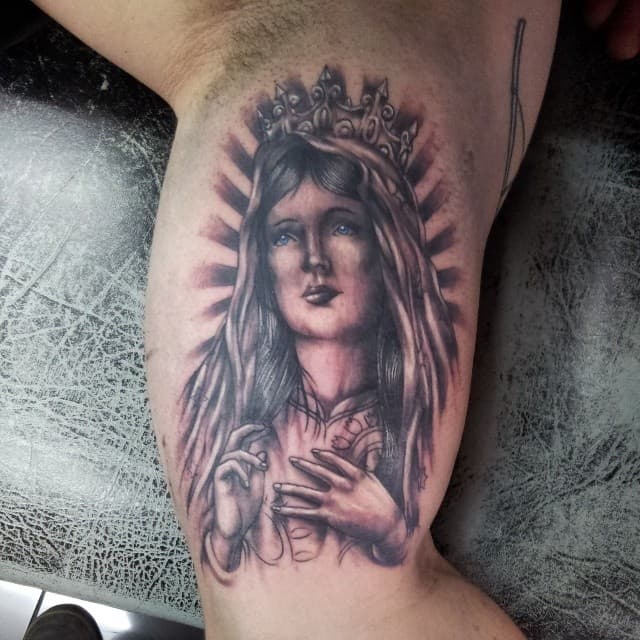 - Изображение Девы Марии. Матерь Спасителя – это тоже довольно распространенный символ в мире религиозной художественной татуировки. Прежде всего такое изображение на теле говорит о духовности, доброте, чистоте, святости, непорочности.