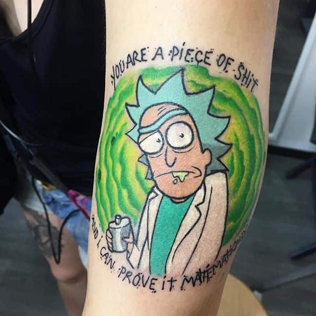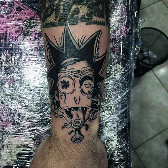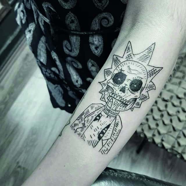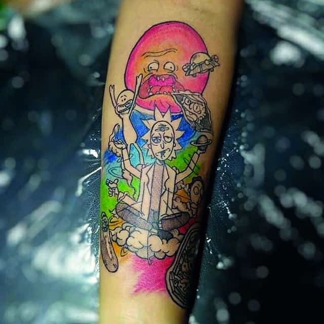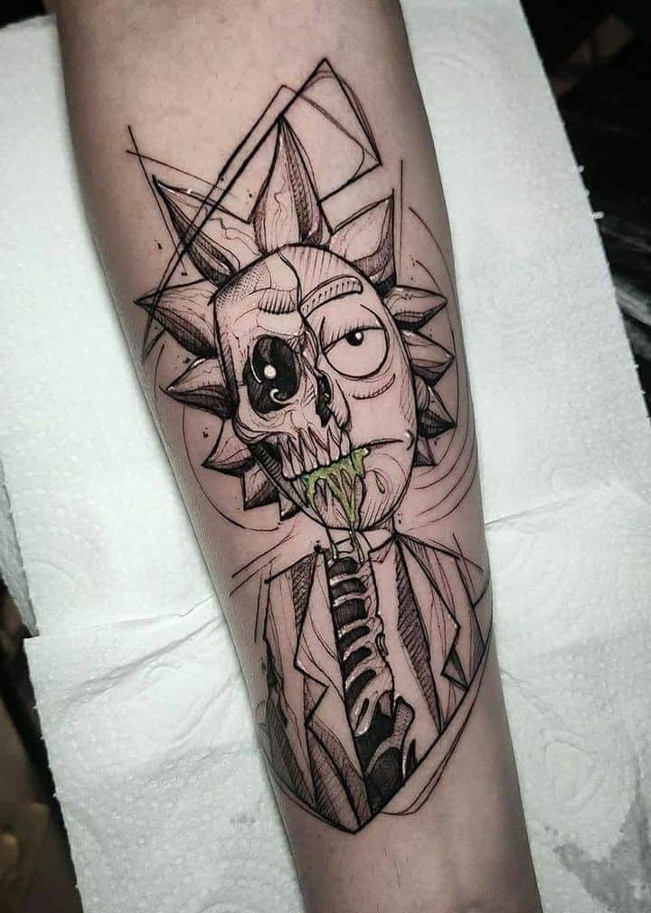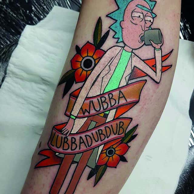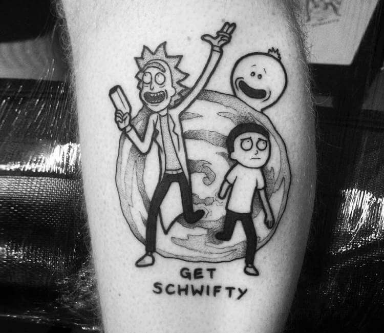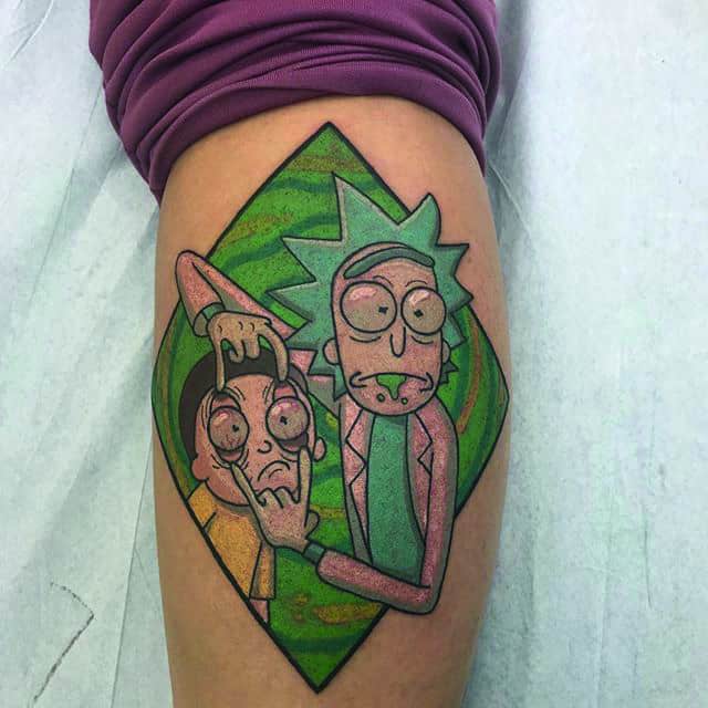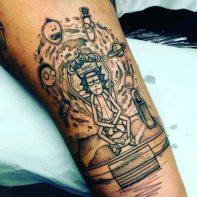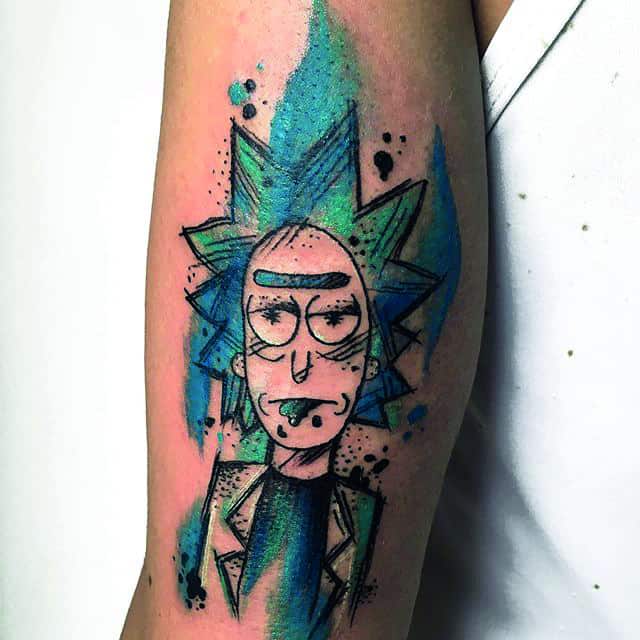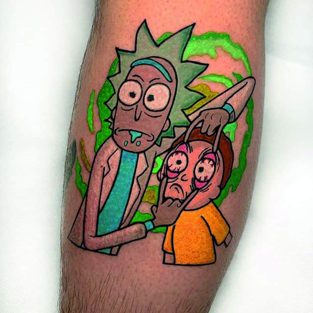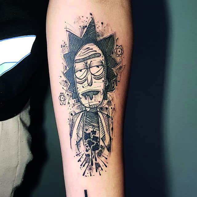 Зачастую, на эскизах изображаются главные герои мультсериала – Рик Санчез со своим внуком-напарником Морти. Классическая сцена, когда профессор Рик раскрывает обеими руками глаза Морти. Легендарная сцена из мультика стала отличной идеей для татуировки. Персонажей рисуют в разных стилях, подписывая картинки смешными надписями или великими цитатами главного героя.