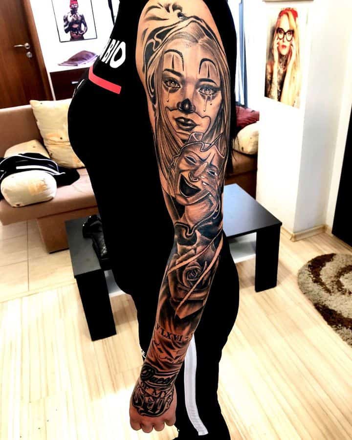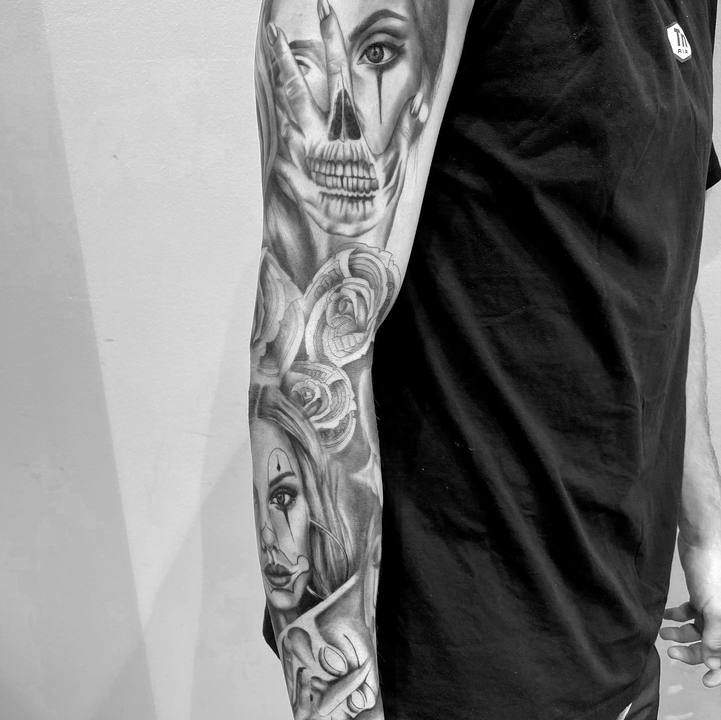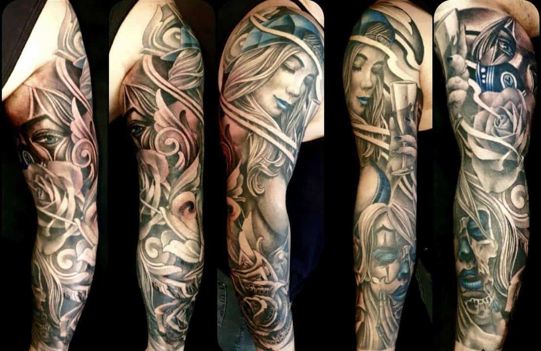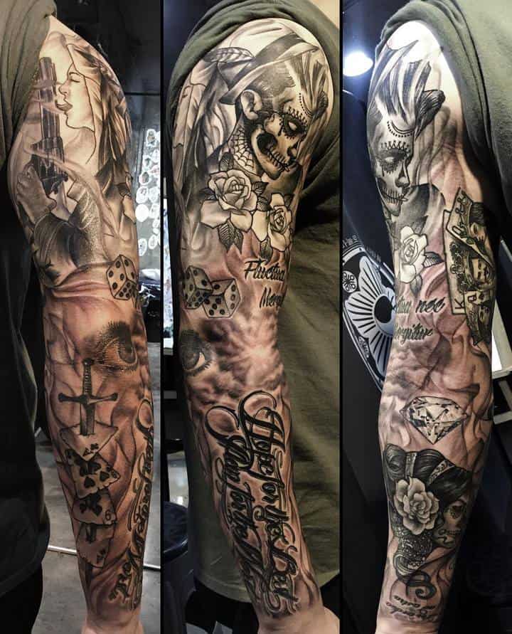 Рукав в стиле чикано – это довольно интересный и креативный вариант. Такая татуировка украсит сильного мужчину и девушку, которая точно знает, чего она хочет от жизни. Обращайтесь в наш тату салон Альянс в Киеве, и мы выполним для вас стильный рукав в этом стиле.
