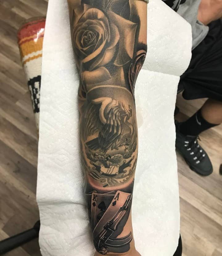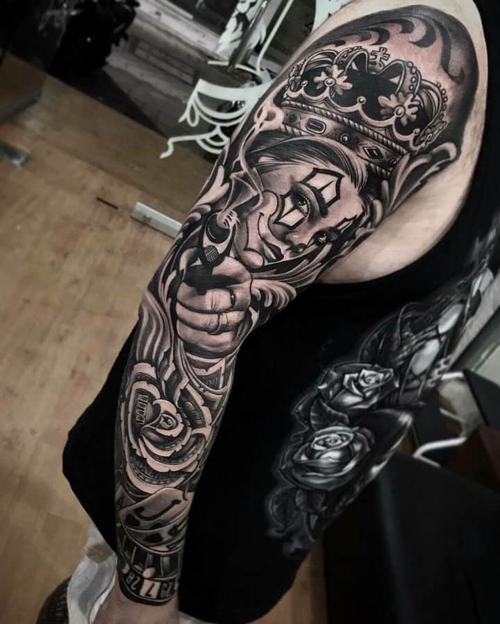 - Розы. Часто можно увидеть и этот цветок в татуировках в стиле чикано. В рукаве роза, понятно, не может выступать единственным символом. Но она будет отлично сочетаться с изображением красивой девушки или револьверами, черепами.
