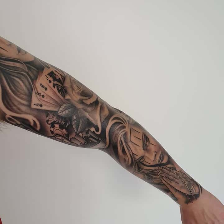 Для тату в стиле чикано, и рукавов в частности, характерна религиозная тематика.