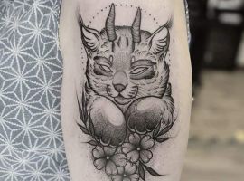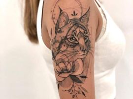 Интересный вариант тату рысь для девушек – хищник с цветами. Элементы природы подчеркнут спокойный нрав, но добавят нотки романтичности.