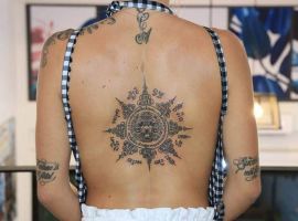 «Сак Янт» – это «священная набивка» в переводе на русский язык. Это древнее искусство восточных стран. Татуировки Сак Янт наносят обученные шаманы, читая при этом древние восточные молитвы – ката. Считается, что такие татуировки обладают сакральной силой, они даруют силы и способность выдерживать любые препятствия своему обладателю. Татуировки выглядят очень интересно и неординарно. Можно взять в пример известную актрису Анжелину Джоли, на теле которой имеется тату сак янт. Сделала голливудская звезда ее во время своего путешествия по странам Азии.