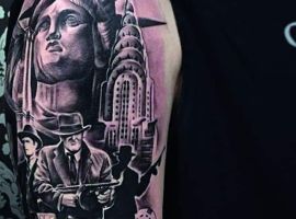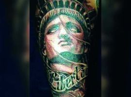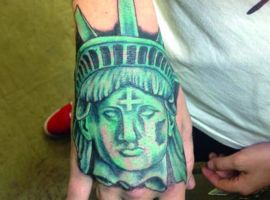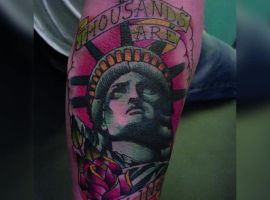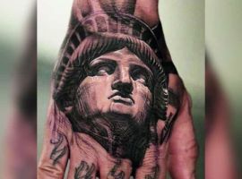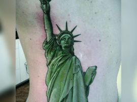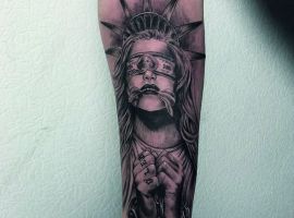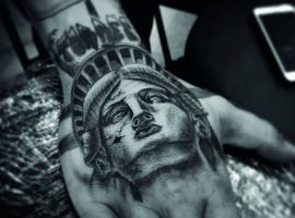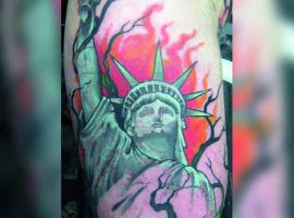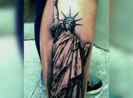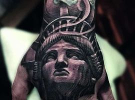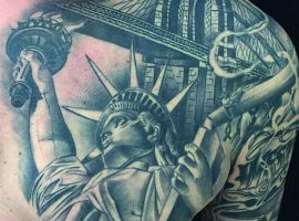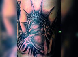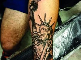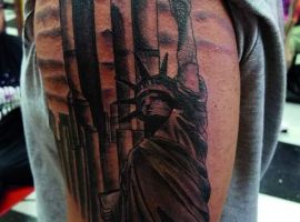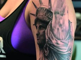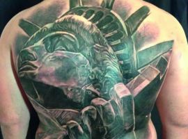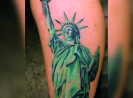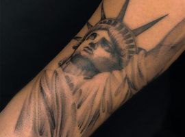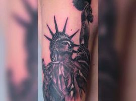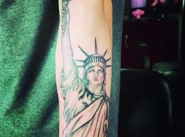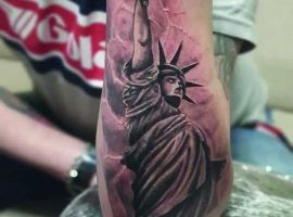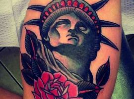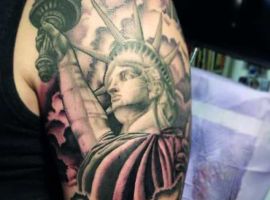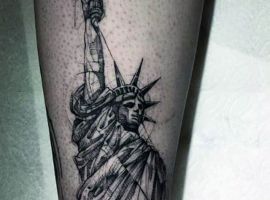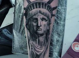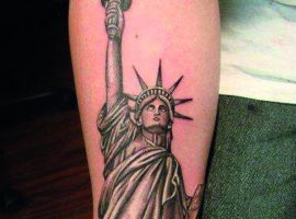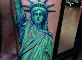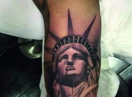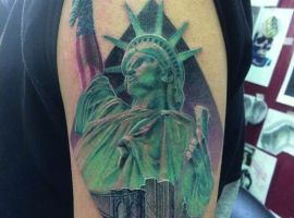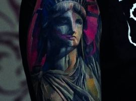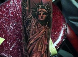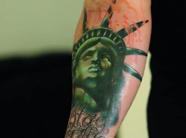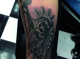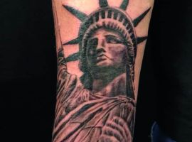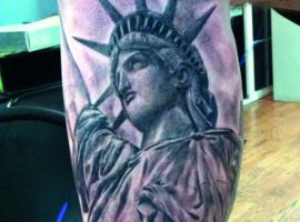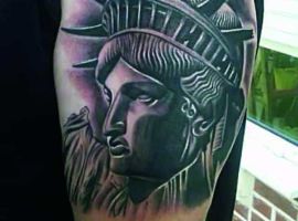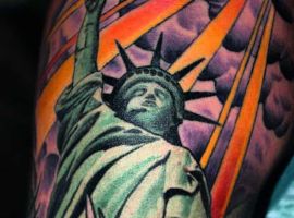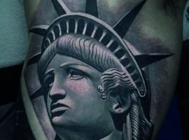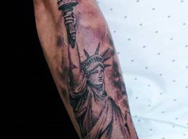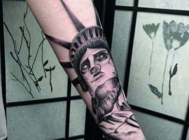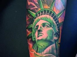 Изображение американской Статуи Свободы не так часто можно встретить на телах людей в нашей стране. Однако, рисунок этот крайне интересен не только с точки зрения выполнения и внешнего вида, но и смысла. Статуя свободы говорит о стремлении сбросить с себя оковы, вольнодумстве, о признании равенства во всеми мире.