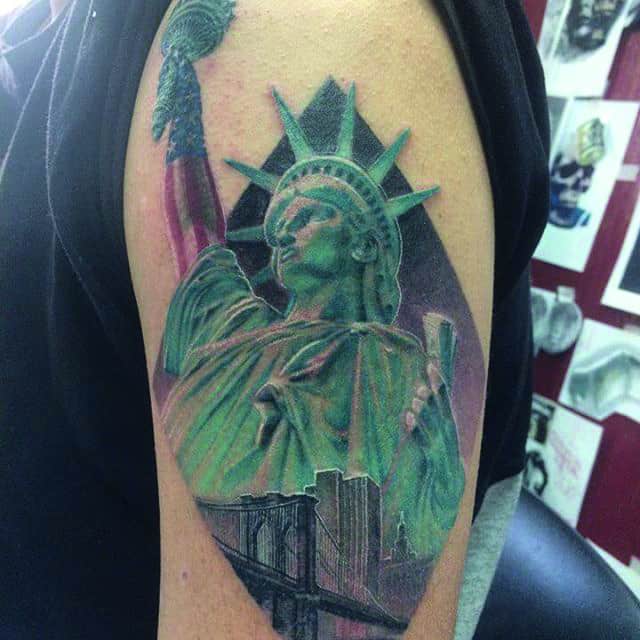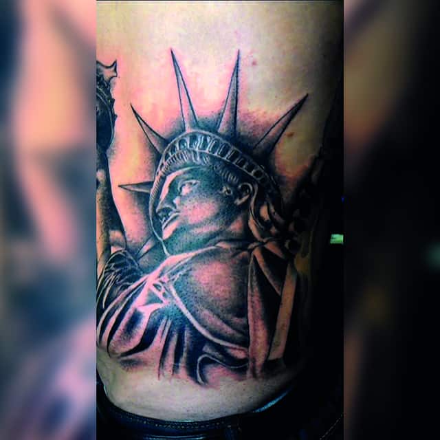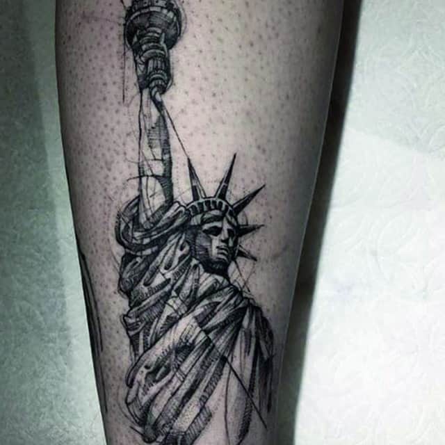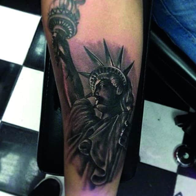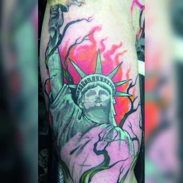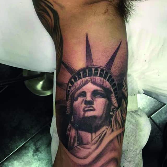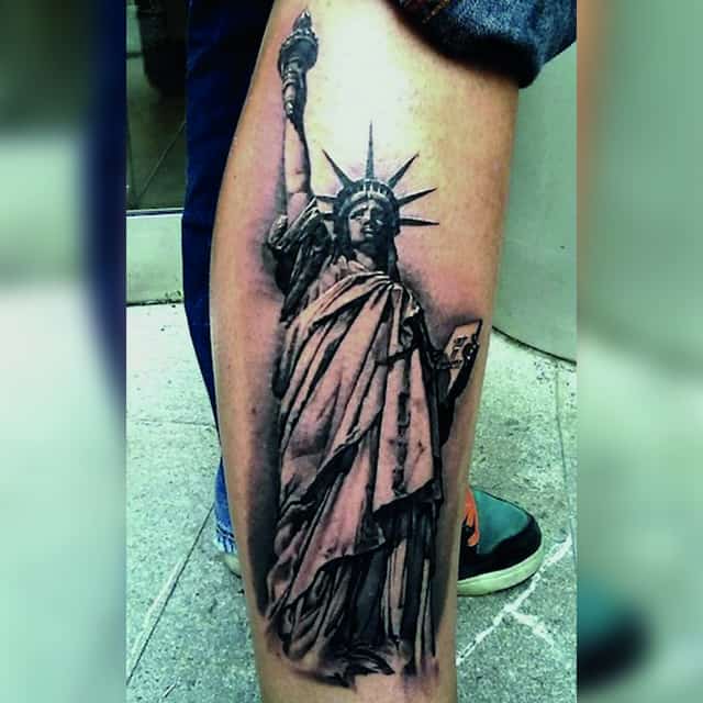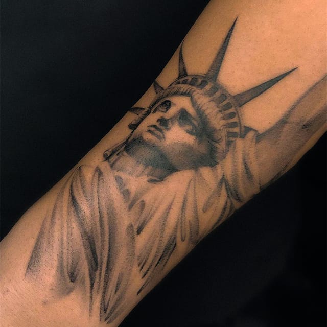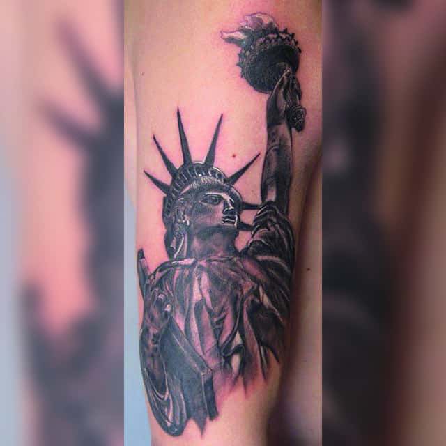 Изображение американской Статуи Свободы не так часто можно встретить на телах людей в нашей стране. Однако, рисунок этот крайне интересен не только с точки зрения выполнения и внешнего вида, но и смысла. Статуя свободы говорит о стремлении сбросить с себя оковы, вольнодумстве, о признании равенства во всеми мире.