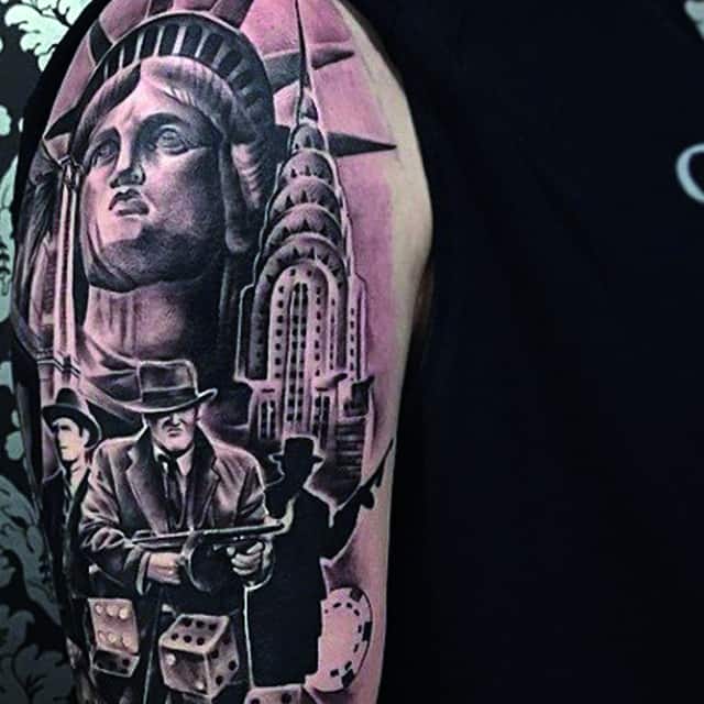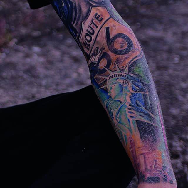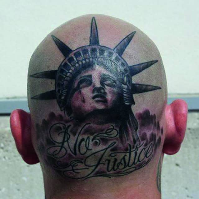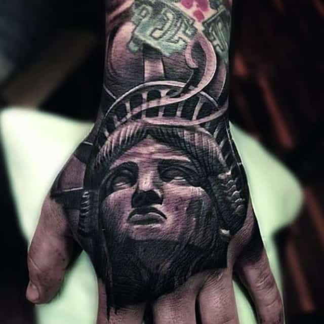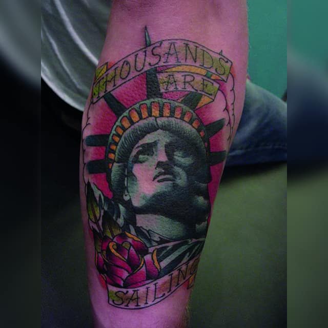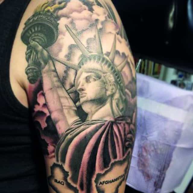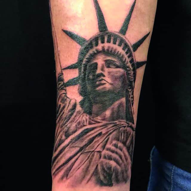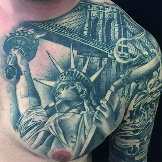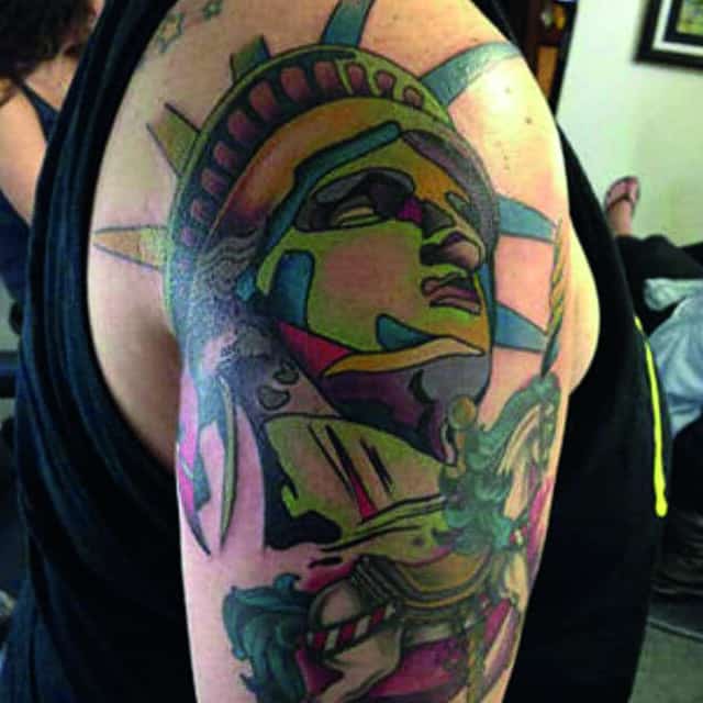 Изображение американской Статуи Свободы не так часто можно встретить на телах людей в нашей стране. Однако, рисунок этот крайне интересен не только с точки зрения выполнения и внешнего вида, но и смысла. Статуя свободы говорит о стремлении сбросить с себя оковы, вольнодумстве, о признании равенства во всеми мире.