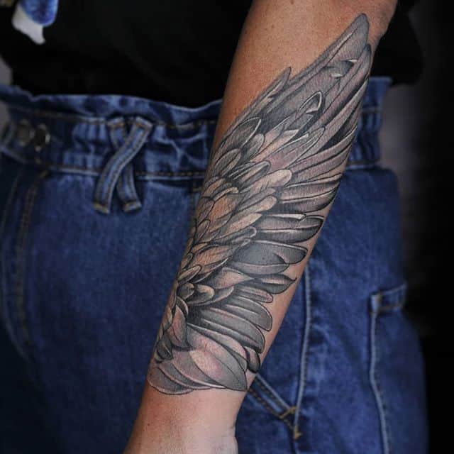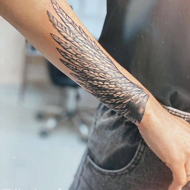 Также довольно часто выбирают и изображение крыльев целиком без непосредственного изображения какой-то птицы. Крылья выполняют в распахнутых, сложенных вариантах. Отлично такой рисунок смотрится масштабным на спине. Но можно выбрать и миниатюрные крылья, к примеру, на запястье или щиколотке.