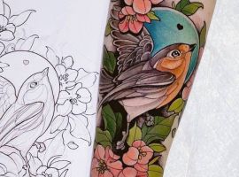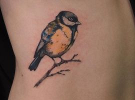 Как правило, такие рисунки всегда цветные. Интересно смотрится такая идея в стиле акварель. Синичку часто изображают сидящей на ветке, или на фоне веток рябины, иногда – пару из двух птичек. Конечно, последний рисунок подойдет девушке. Которая хочет привлечь в свою жизнь любовь и удержать ее. Мастера из салона Альянс в Киеве создадут для Вас эскиз!
