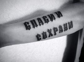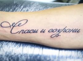 Еще один простой эскиз, который пользуется популярностью, надпись «спаси и сохрани», выполненная в рукописном стиле. Обычно его размещают на предплечье и дополняют другими символами. Интересный вариант – надпись, украшенная завитками и розой. Цветок считается символом Богородицы, поэтому владелец тату полагается на ее защиту.