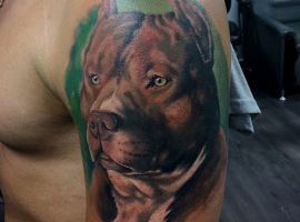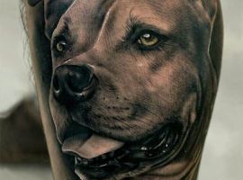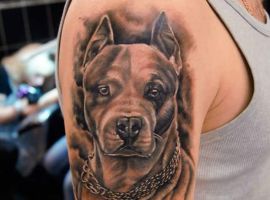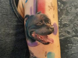 Татуировки с собаками выбирают люди по разным причинам. Для одних – это показ любви к своему питомцу. Другие хотели бы запечатлеть качества характера, которые есть у собак, и показать таким образом окружающим, что они являются людьми верными, любящими, всегда готовы прийти на выручку. Как видно по фотографиям тату стафф становятся настоящими произведениями искусства и выглядят действительно как нательная живопись. Мастера тату салона Альянс имеют большой опыт работы, поэтому могут выполнить татуировку в любом стиле со стаффорд терьером.