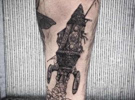 Также элементами татуировки в стиле стимпанк могут быть телефонные аппараты, воздушные шары и дирижабли, часы и подводные корабли, различные машины, работающие на пару.