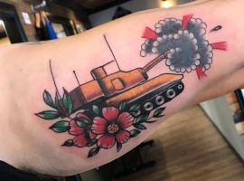 - миролюбие. Парадоксально, но танк может быть символом миролюбия носителя татуировки и его нелюбви к войне. В этом случае можно выбрать интересную окраску танка, например, сделать его нежно-розовым, или дополнить изображение цветами или лентами с пацифистскими лозунгами;