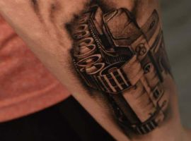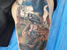- реализм. От мастера при выборе такого эскиза требуется большое мастерство. Ведь он должен передать, из какого материала сделан танк, воссоздать малейшие детали, которые и делают татуировку фотографически точной. Важно помнить, что реалистичные тату не могут быть маленькими. Поэтому такой эскиз станет идеальным вариантом для спины, груди или бедра;
