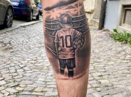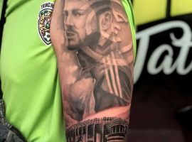 - Первой Месси татуировкой стал портрет матери на спине. Татуировка на икре левой ноги – ладошки первого сына футболиста, а под ними сердце с именем мальчика. В нижней части живота набиты губы, что символизирует поцелуй жены. Тату Месси на ноге с обратной стороны, где набиты руки сына, представляет собой подобие гетры с футбольным мячом и числом 10 – номером, под которым играет футболист. Самое крупное изображение на теле спортсмена – Иисус Христос на предплечье. Месси тату на руках: карта города, шестеренки, старые часы, четки. Также известен тату Месси на руке эскиз с глазом жены.
