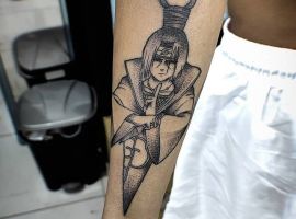 Пожалуй самым популярным в мире татуировок персонажем комиксов является Бетмен. Впервые о нем услышали еще в 1939 году! С того времени внешний вид темного рыцаря менялся много раз – от серого костюма с голубым плащом до полностью черного наряда. Бетмена считали стражем, спасителем города Готэма. Не смотря на то, что он не обладал сверхъестественными навыками или суперспособностями, он отлично владел своим телом, занимался восточными единоборствами. Также изюминкой Бетмена является “дружба” с новыми технологиями, которые он постоянно использовал против своих врагов. Этот герой является примеров смелости, справедливости, бесстрашия.