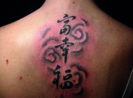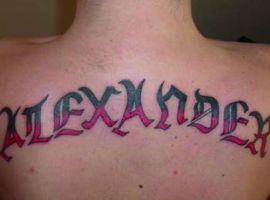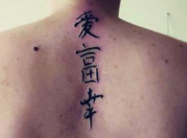 На спине мужские татуировки располагаются обычно на лопатках или в области плечевого пояса. Это связано с особенностями анатомии, рисунок подчеркивает широкие плечи. Мужчины часто стараются выделить нанесенную надпись, выбирают шрифт с грубыми резкими линиями, крупные буквы, контрастные цвета. Популярны арабские надписи, иероглифы, тату с 3D эффектом.