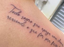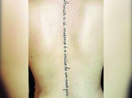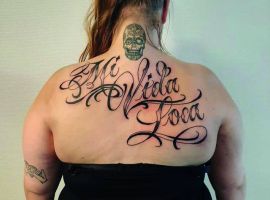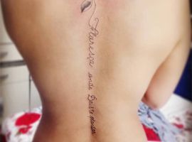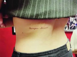 На пояснице татуировка выглядит женственно, подчеркивает талию и даже может скрыть недостатки фигуры. Здесь можно нанести как небольшую фразу, так и крупный рисунок с вплетенными в него словами. В последнее время девушки стали все чаще набивать фразы в верхней части спины или даже на шее. Это позволяет заявить о себе, выразить свою индивидуальность.