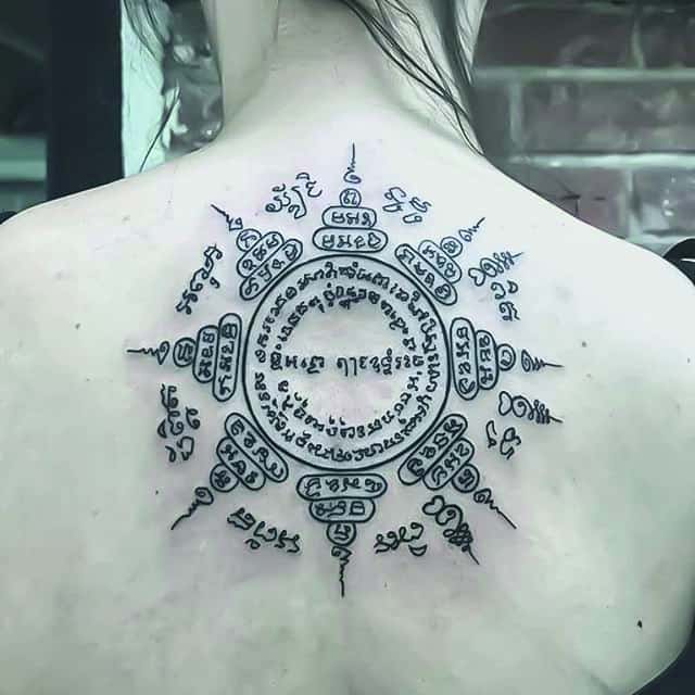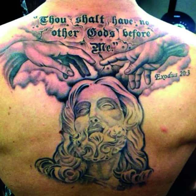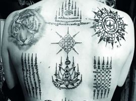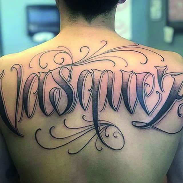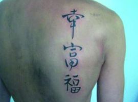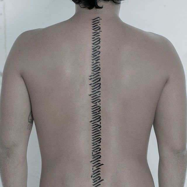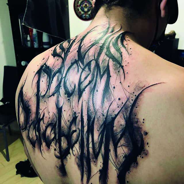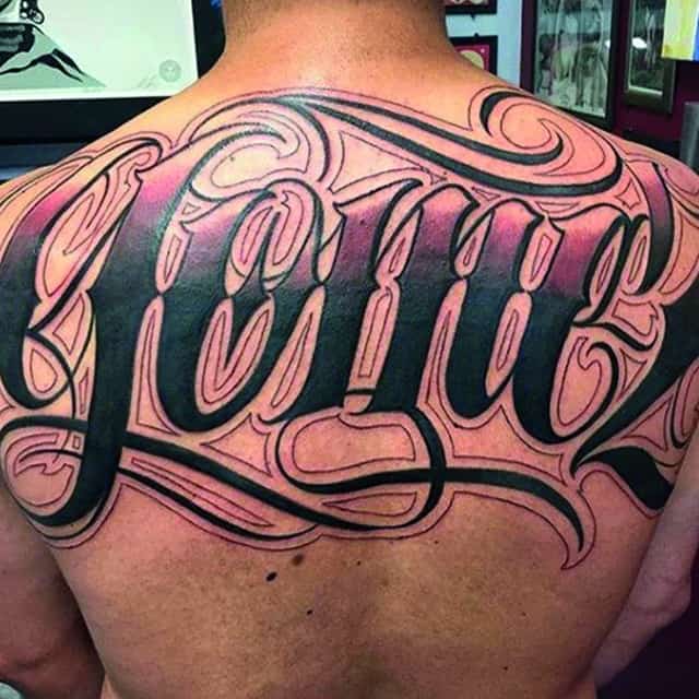 На спине мужские татуировки располагаются обычно на лопатках или в области плечевого пояса. Это связано с особенностями анатомии, рисунок подчеркивает широкие плечи. Мужчины часто стараются выделить нанесенную надпись, выбирают шрифт с грубыми резкими линиями, крупные буквы, контрастные цвета. Популярны арабские надписи, иероглифы, тату с 3D эффектом.