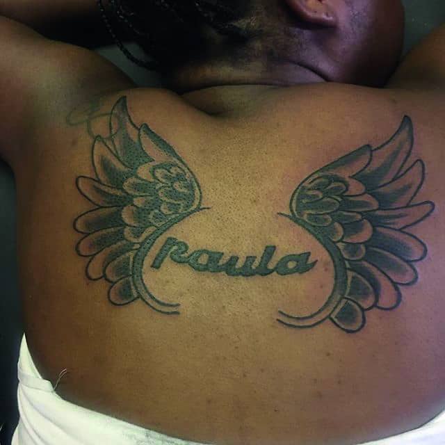 Одной из популярных женских татуировок на лопатках сейчас являются крылья. Такое изображение может иметь разные значения: непорочность, духовную силу, красоту, стремление к свободе, независимость от условностей, веру в божественную волю. Сочетание крыльев с надписью помогает дополнить смысл изображения, понять, что вкладывает в него человек.