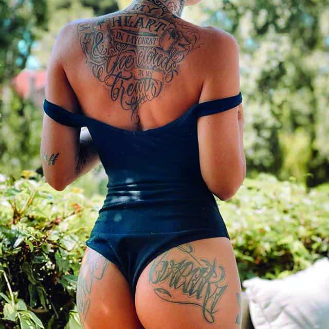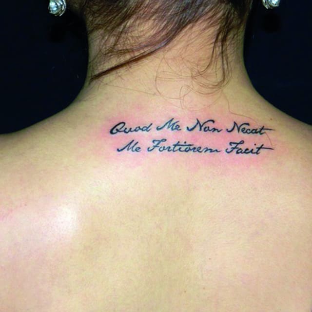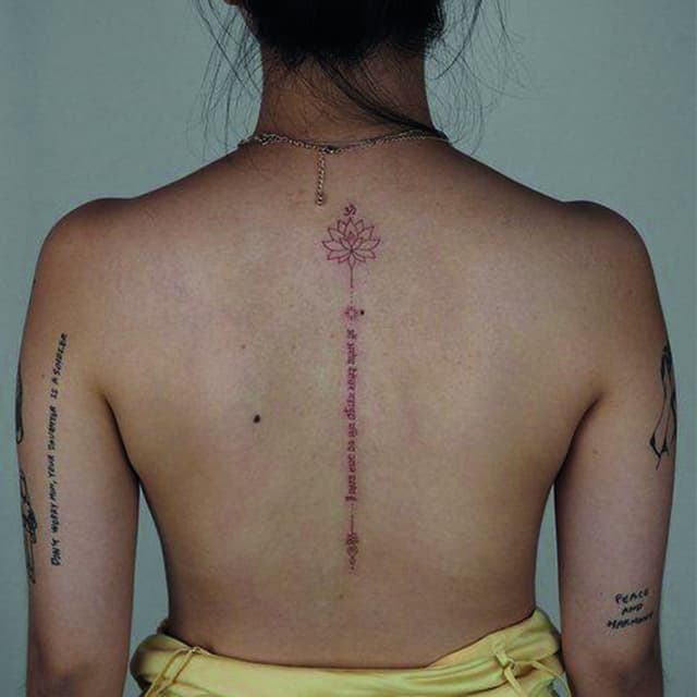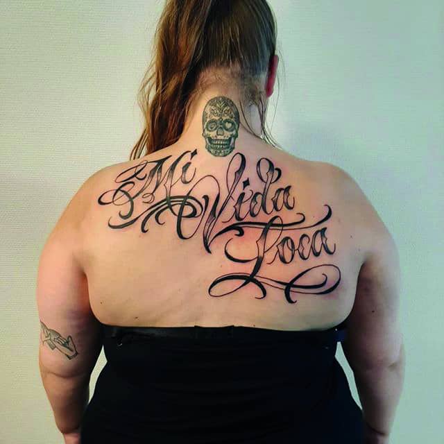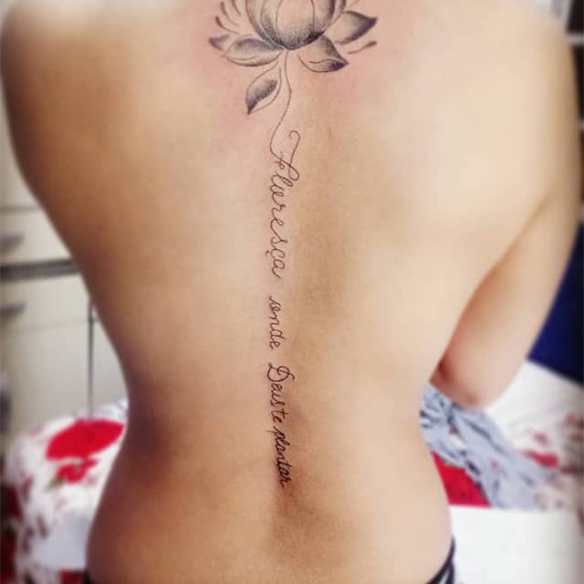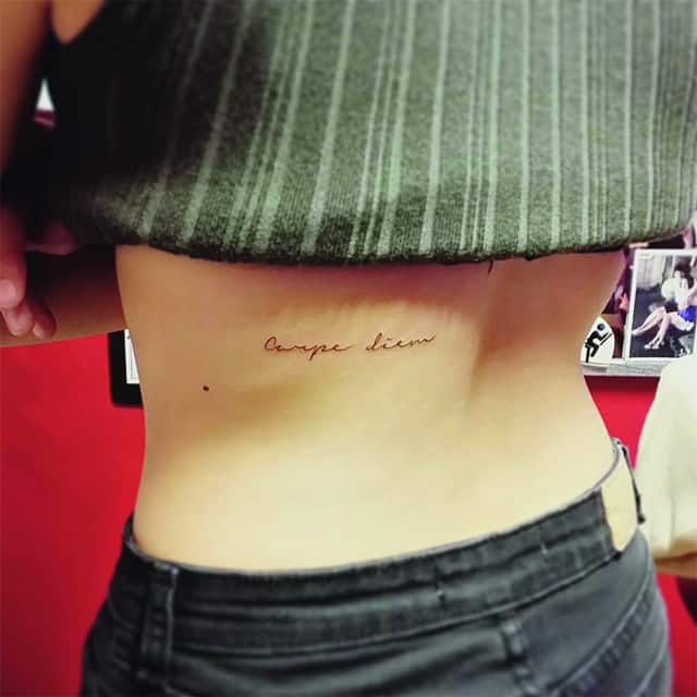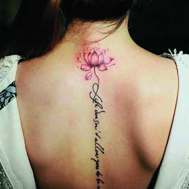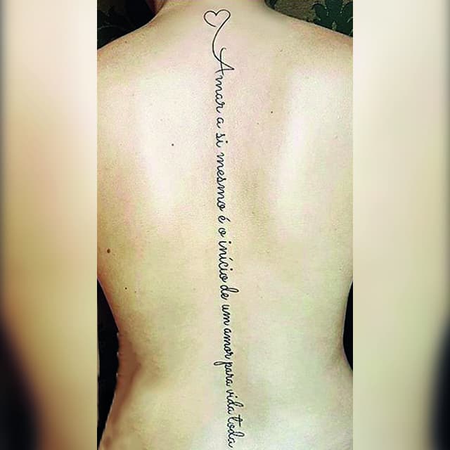 На пояснице татуировка выглядит женственно, подчеркивает талию и даже может скрыть недостатки фигуры. Здесь можно нанести как небольшую фразу, так и крупный рисунок с вплетенными в него словами. В последнее время девушки стали все чаще набивать фразы в верхней части спины или даже на шее. Это позволяет заявить о себе, выразить свою индивидуальность.