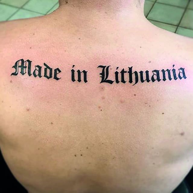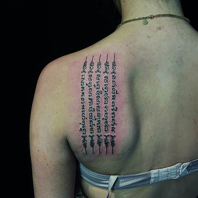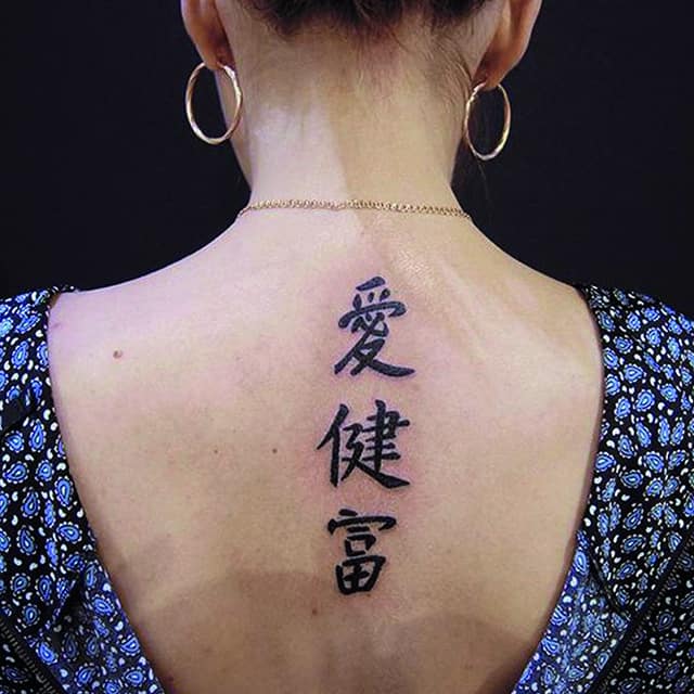 Чаще всего набиваются фразы на иностранных языках: на латыни, английском, французском. Популярны иероглифы, так как один символ может иметь глубокое значение. Кроме того, их удобно наносить вдоль позвоночника. Выбор иностранных языков объясняется тем, что смысл фразы будет известен только самому обладателю татуировки.