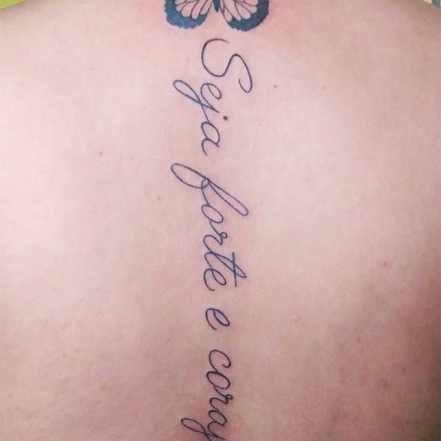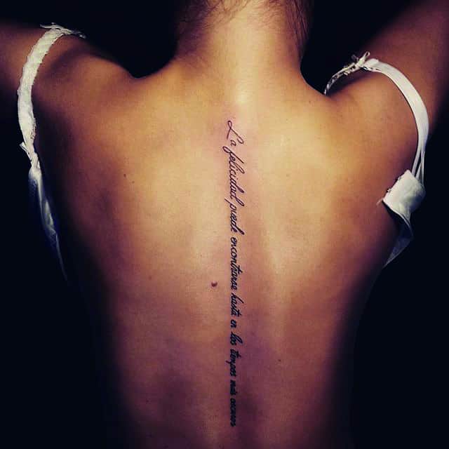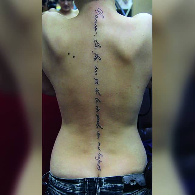 Особенно популярны тату надписи у девушек. Обычно они выбирают поясницу или верхнюю часть спины. Часто надпись переходит на ребра, шею. Красиво также смотрится длинная фраза, написанная каллиграфическим почерком вдоль позвоночника. В восточных странах верят, что такая татуировка сильно влияет на характер и судьбу человека. Ведь позвоночник – это энергетический центр организма. Поэтому желательно выбирать надписи с положительным смыслом.